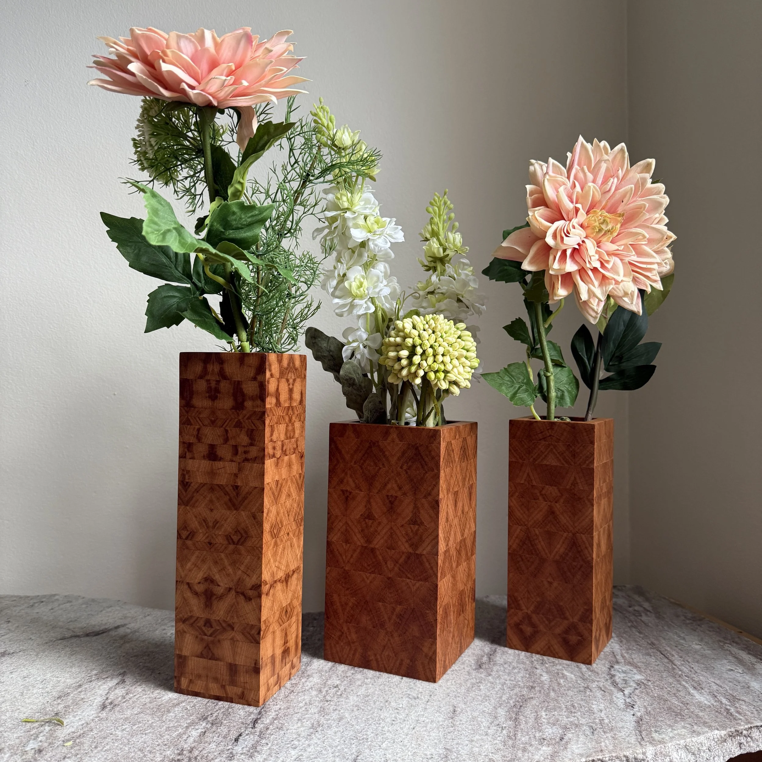 Every piece is built entirely by her hands, from raw exotic hardwood to finished object. Sliced, arranged, and book-matched, those end-grain faces become something closer to geometry than craft. And because no two trees are alike, no two pieces ever are either.