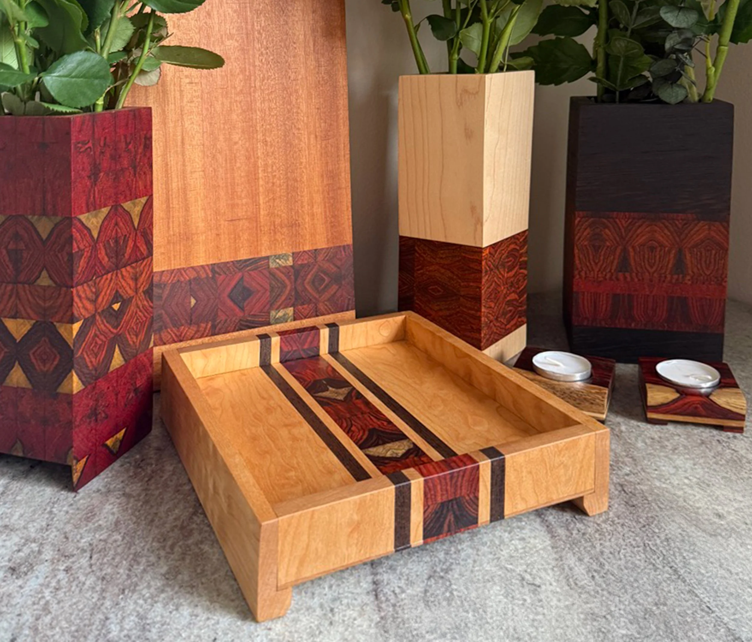 Cocobolo is one of the most sought-after hardwoods in the world, and the moment you see it in person, it's obvious why. Native to Central America, it's famous for its deep, jewel-like colors — rich reds, burnt oranges, and dark espresso tones — and a natural grain so vivid it almost looks painted. Crafted with end grain cocobolo on all four sides, this vase turns that wild figuring into a repeating geometric pattern that's genuinely unlike anything else you'll find.